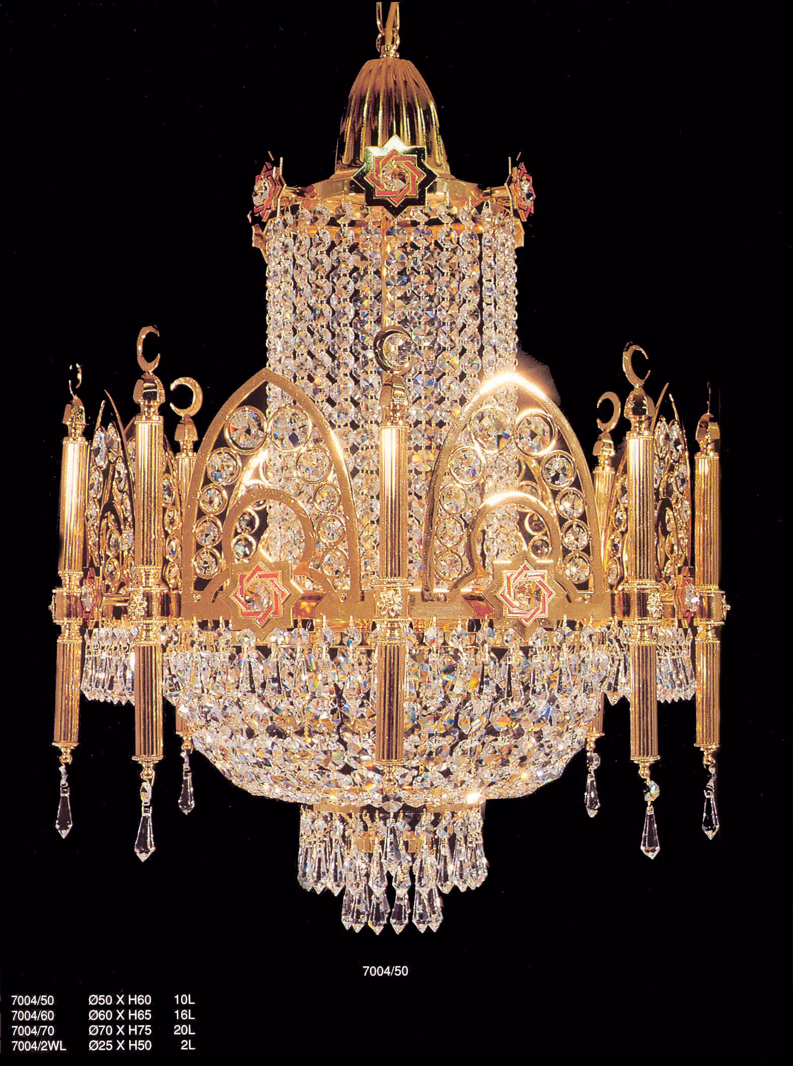 - Material: Kristallglas-Behang in Wabenanordnung an Trommel und Basis, Mihrab-Bögen mit Strass-Besatz, klassisch ornamentierte Kerzenarme, Tragrahmen in Messing-Optik
